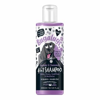 O Bugalugs Champô para Cão 4 em 1 com alfazema e camomila é uma solução completa para a higiene e cuidado do seu animal de estimação. Com uma fórmula suave e eficaz, este champô limpa, desembaraça, desodoriza e condiciona o pelo, deixando-o macio, brilhante e com um aroma fresco e relaxante.