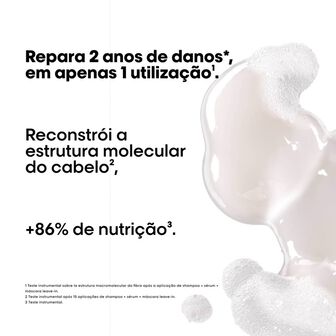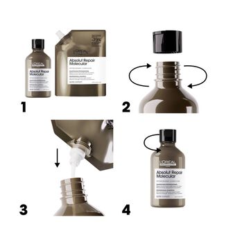 Aplicar sobre o cabelo molhado. Emulsionar até fazer espuma. Passar por água. Para resultados otimizados, aplicar de seguida Absolut Repair Molecular Sérum e a máscara sem passar por água.