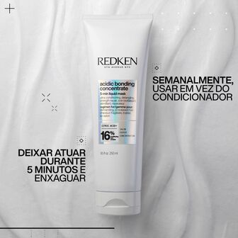 A máscara líquida profissional Acidic Bonding Concentrate, da Redken, foi desenvolvida com tecnologia bonding que se funde rapidamente no cabelo para uma reparação e hidratação profunda em 5 minutos.