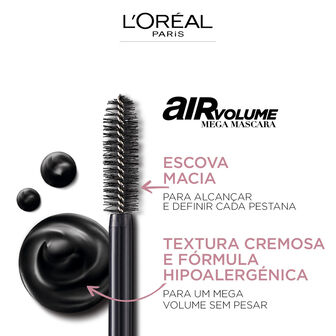 Descobre a nova máscara de Pestanas Air Volume Mega Mascara de L'Oréal Paris, com uma tecnologia única! Graças à sua fórmula injectada com ar, a sua textura é ultra cremosa e ultraleve! Consegue um mega volume instantâneo sem pesar! Tão leve como ar! Adequada para olhos sensíveis.