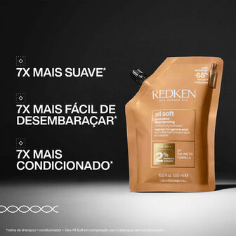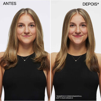 O Shampoo All Soft Redken é infundido com Óleo de Argão para limpar, hidratar e suavizar o cabelo seco e quebradiço, criando um aspeto e sensação de condicionamento 15x superior.
