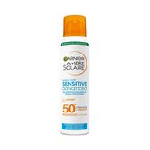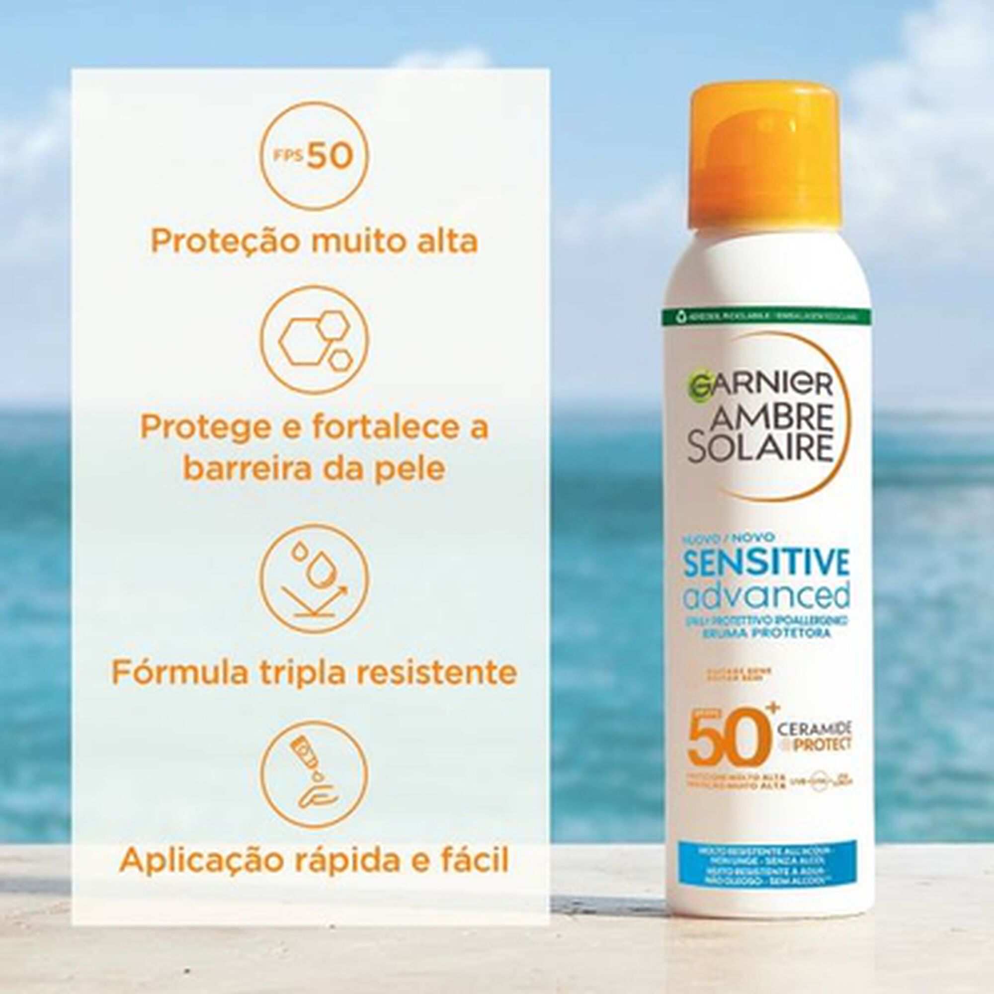 Garnier Ambre Solaire Sensitive Advanced, uma bruma hipoalergénica de proteção muito alta FPS50+, contra os raios UVB e UVA.
