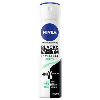 O NIVEA Black & White Invisible Active Spray 150 ml é o desodorizante antitranspirante sem álcool e antibactérias que não deixa manchas na roupa escura e reduz o aparecimento de manchas amarelas na roupa branca.