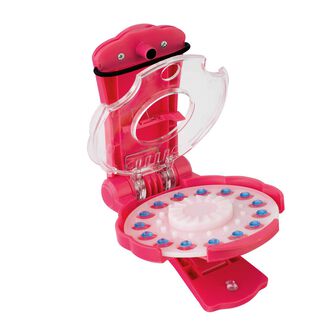 Opção B: Puxa a pega para baixo de forma a abrires o Aplicador de Brilhantes a 180 graus. Basta colocares a superfície do objeto ou tecido onde desejas colar os brilhantes em uma superfície lisa e reta. Pressiona firmemente para adicionares um brilhante ao teu cabelo, roupa ou acessórios.