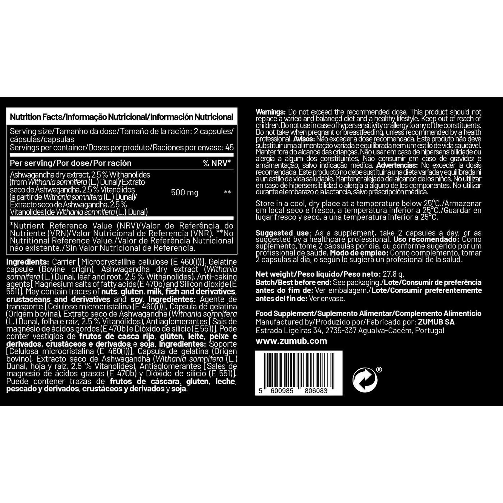 As cápsulas Ashwagandha Zumub contêm puro extrato de withania somnifera, cultivada na Índia e processada posteriormente com muito cuidado para se fazer um suplemento natural.