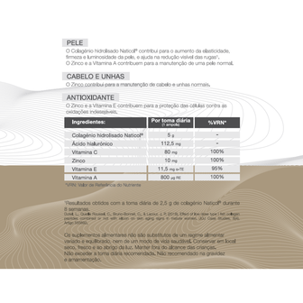 Pele: O Colagénio hidrolisado Naticol® contribui para o aumento da elasticidade, firmeza e luminosidade da pele, e ajuda na redução visível das rugas¹. O Zinco e a Vitamina A contribuem para a manutenção de uma pele normal.