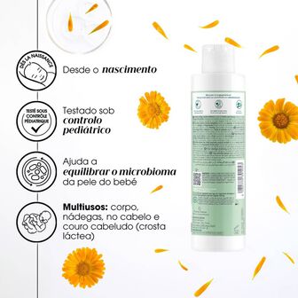 Com extrato de calêndula biológica, a sua fórmula com ingredientes 100% naturais limpa suavemente sem enxaguar e ajuda a equilibrar o microbioma da pele. A sua textura sedosa é ideal para massagens e deixa uma película protetora para proteger a pele das agressões externas, o que é ideal para utilizar na pele seca do bebé.