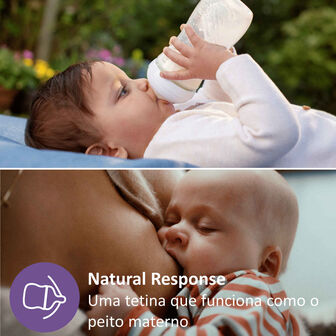 O bebé pode sugar, engolir e respirar seguindo o seu ritmo natural, tal como no seio. As novas tetinas Natural Response são diferentes das tetinas de fluxo livre, o leite só flui quando o bebé chupa ativamente. Tal como a amamentação, pode demorar algum tempo a acertar. Isto é completamente normal.