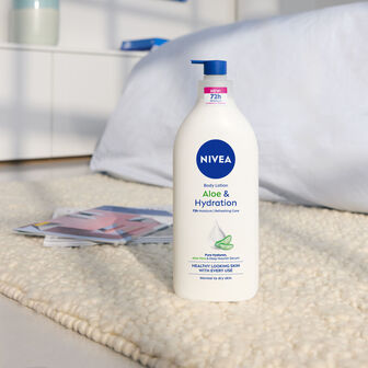 Transforme a sua pele seca com o NIVEA® Body Lotion Aloe Vera, com a nova e melhorada fórmula que proporciona uma hidratação de 72 horas clinicamente comprovada. Para uma pele com aspeto saudável em cada utilização.