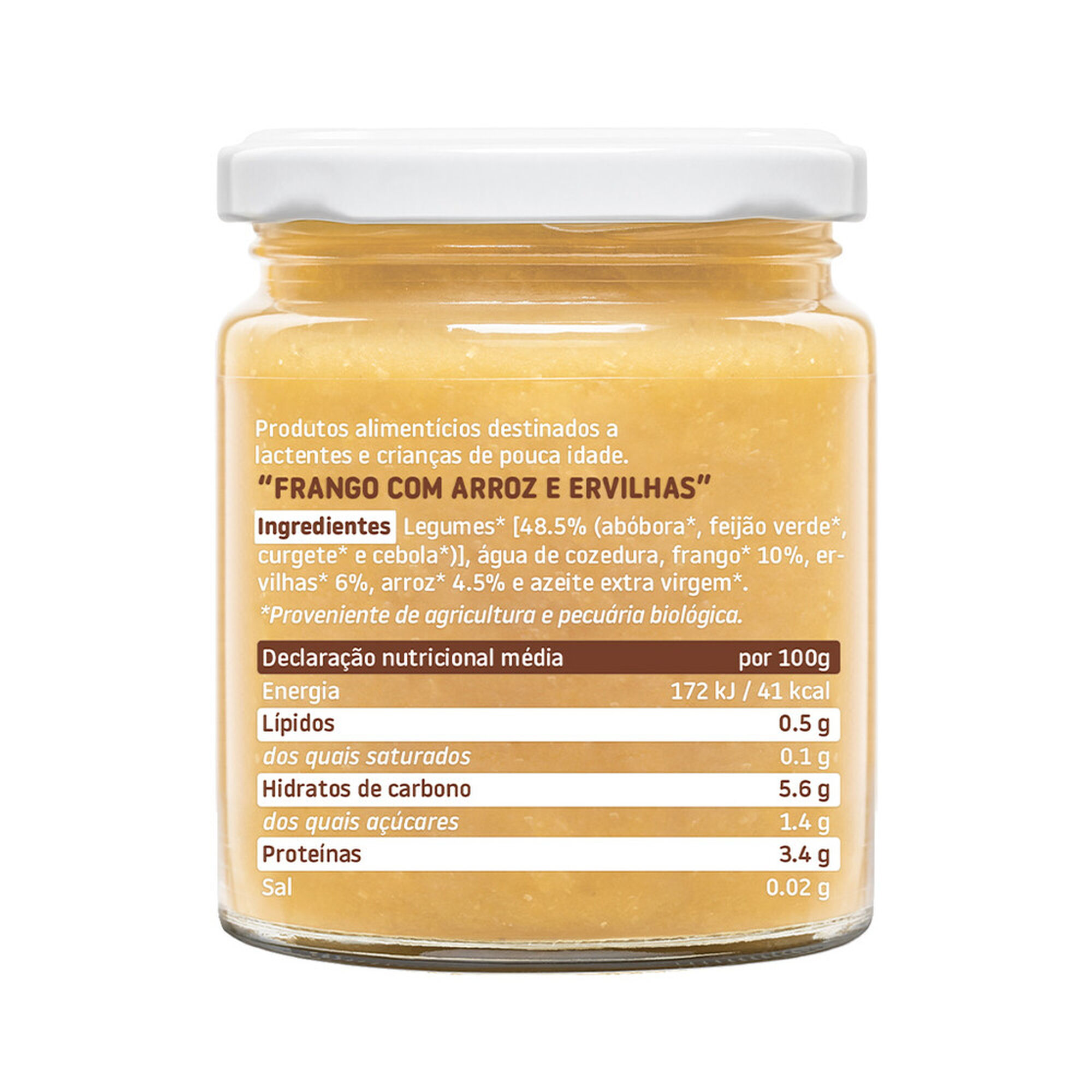 Legumes* [48.5% (abóbora*, feijão verde*, curgete* e cebola*)], água da cozedura, frango* 10%, ervilhas*6%, arroz* 4.5% e azeite extra virgem*. *Proveniente de agricultura e pecuária biológica.