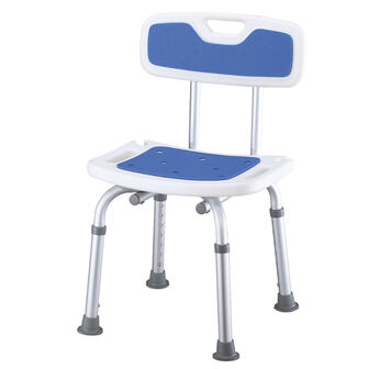 Cadeira de banho. Com uma forra em espuma azul para dar mais conforto ao utilizador. Estrutura em alumínio com borrachas antideslizantes. Regulável em altura de 69 a 79 cm.