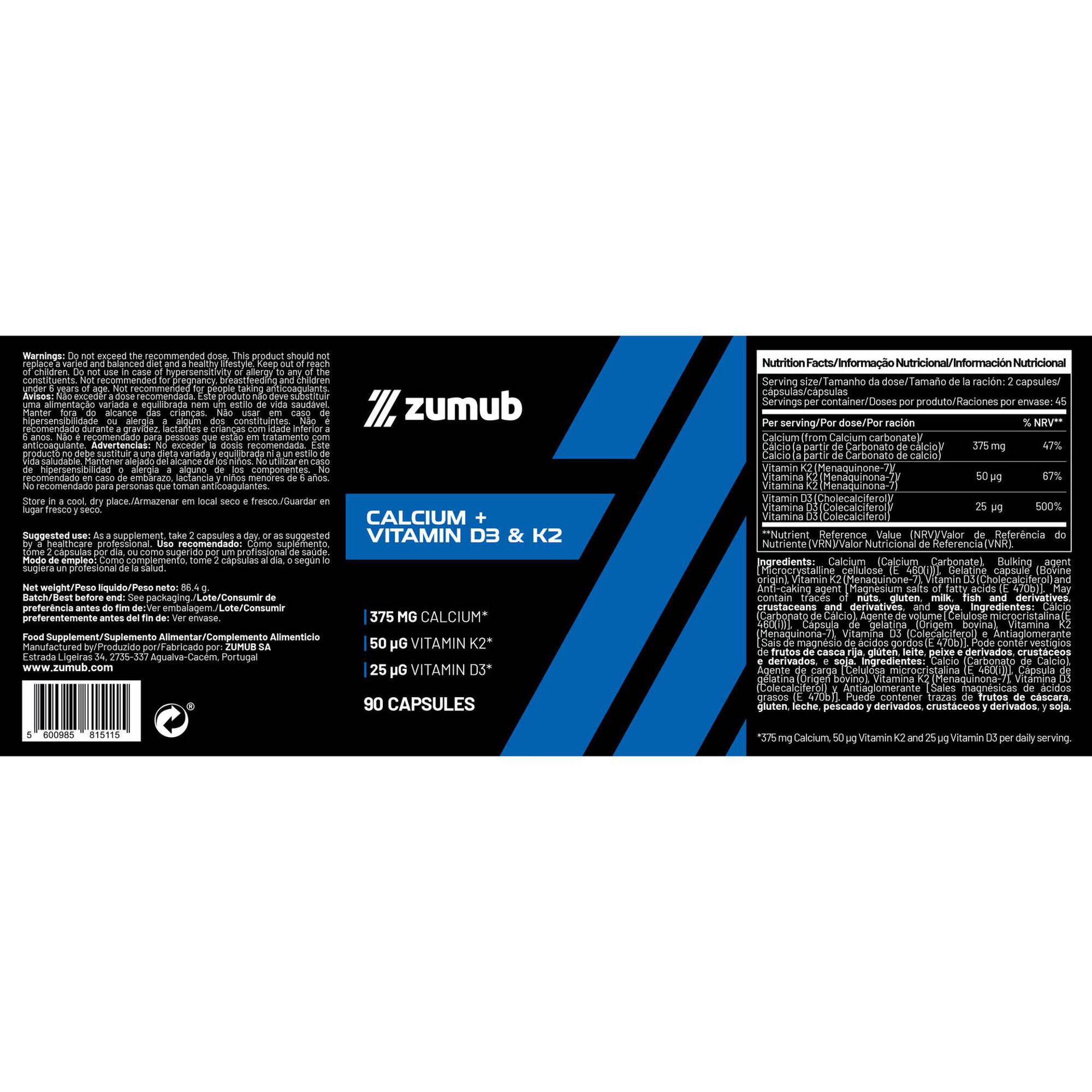 O suplemento Calcium + Vitamins D3 & K2 da Zumub foi desenvolvido para apoiar a saúde óssea, muscular e vascular, reunindo três nutrientes fundamentais numa fórmula prática e eficaz. A dose diária combina: