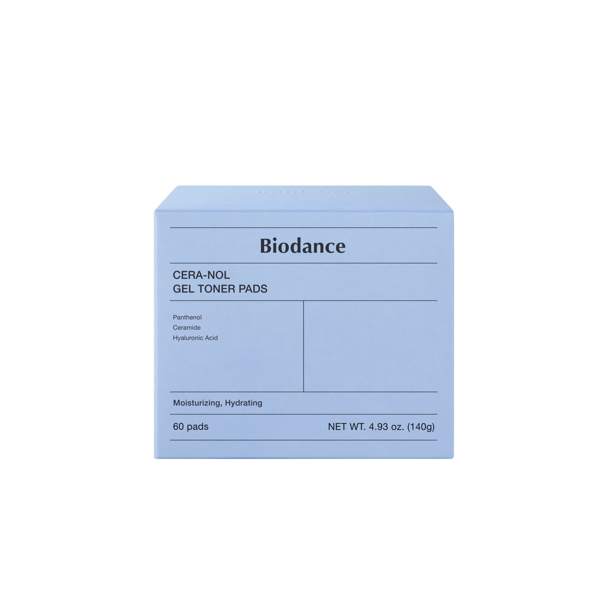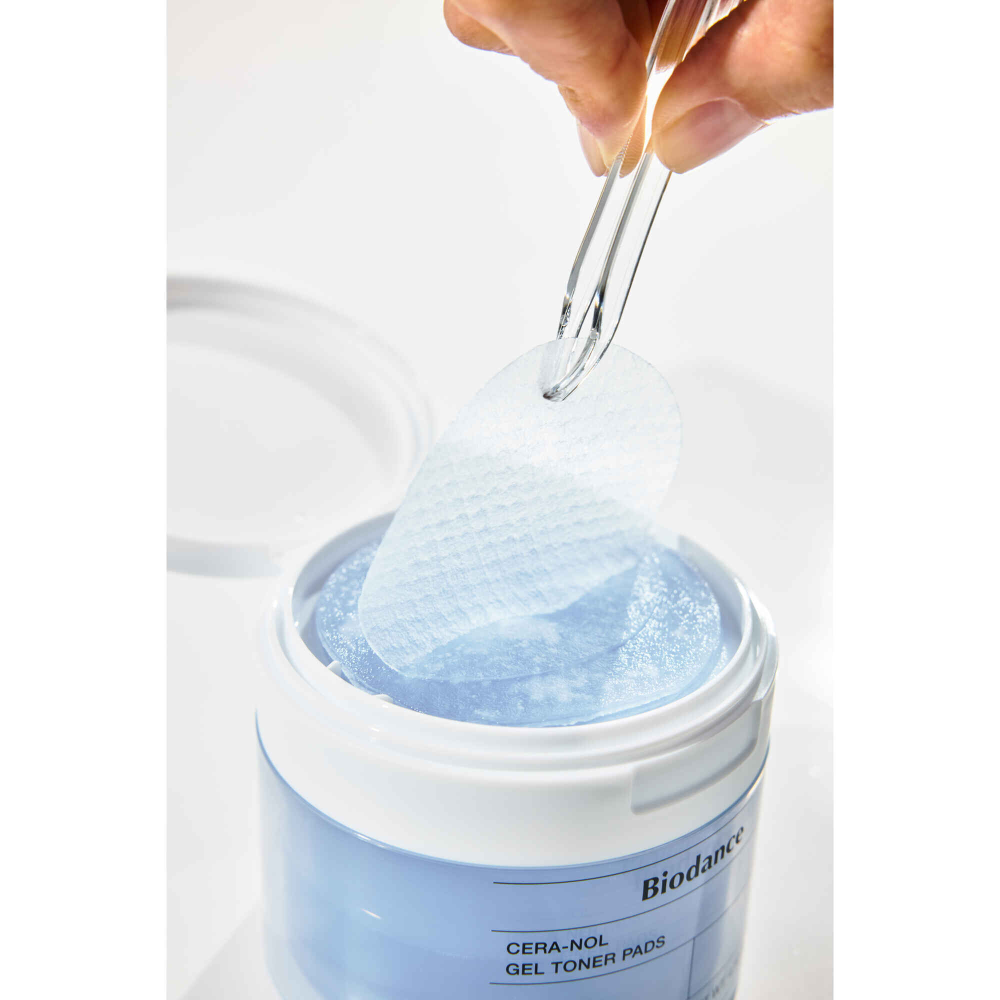 Discos em gel hidratantes e húmidos com pantenol, ceramidas e ácido hialurónico.