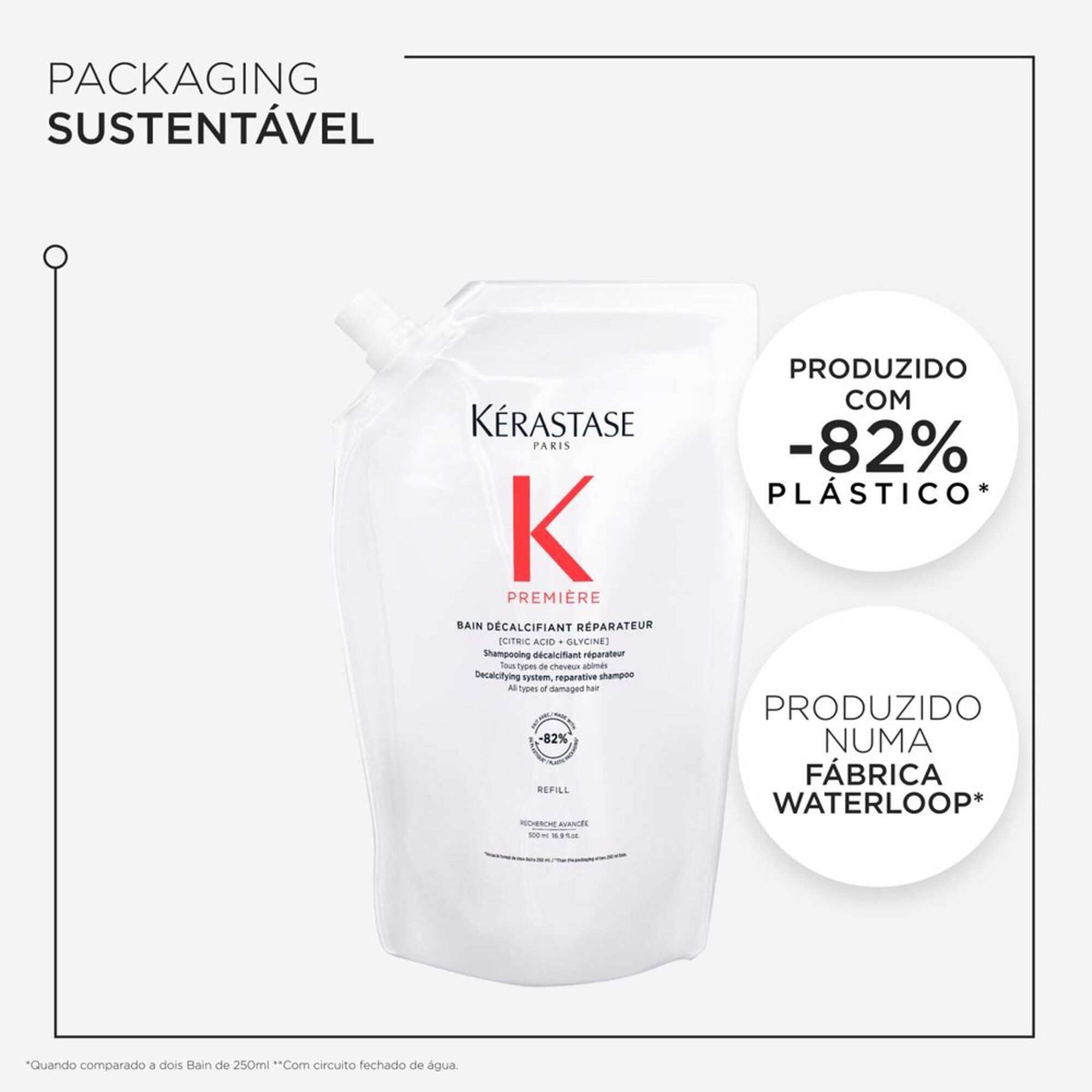 A embalagem de champô recarregável de 500 ml, produzida com plastico reciclado* numa fábrica que atingiu 100% de energia renovável**, pode ser recarregada com a recarga correspondente, produzida com -82% de plástico na embalagem* numa fábrica waterloop**.