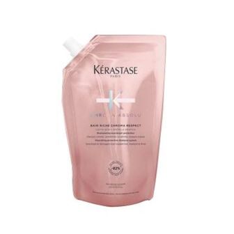 Champô Recarga Chroma Absolu Respect Bain Riche oferece hidratação intensa para suavizar a fibra capilar, reduzindo a porosidade para manter a cor por mais tempo.