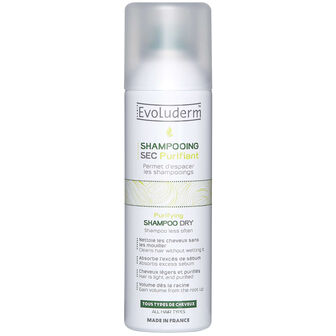 O champô seco purificante da Evoluderm limpa o cabelo sem ser necessário molhá-lo e absorve o excesso de sebo nas raízes.