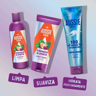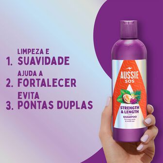 Fortalece o cabelo fraco e quebradiço protegendo-o da quebra e pontas espigadas, o cabelo fica sensacional, a mostrar amor pela vida e heroicamente hidratado! Para obter os melhores resultados use-o em conjunto com o Condicionador Aussie SOS Strength & Length. Contra danos provocados ao pentear, quando comparado à utilização do champô sem condicionador apenas.