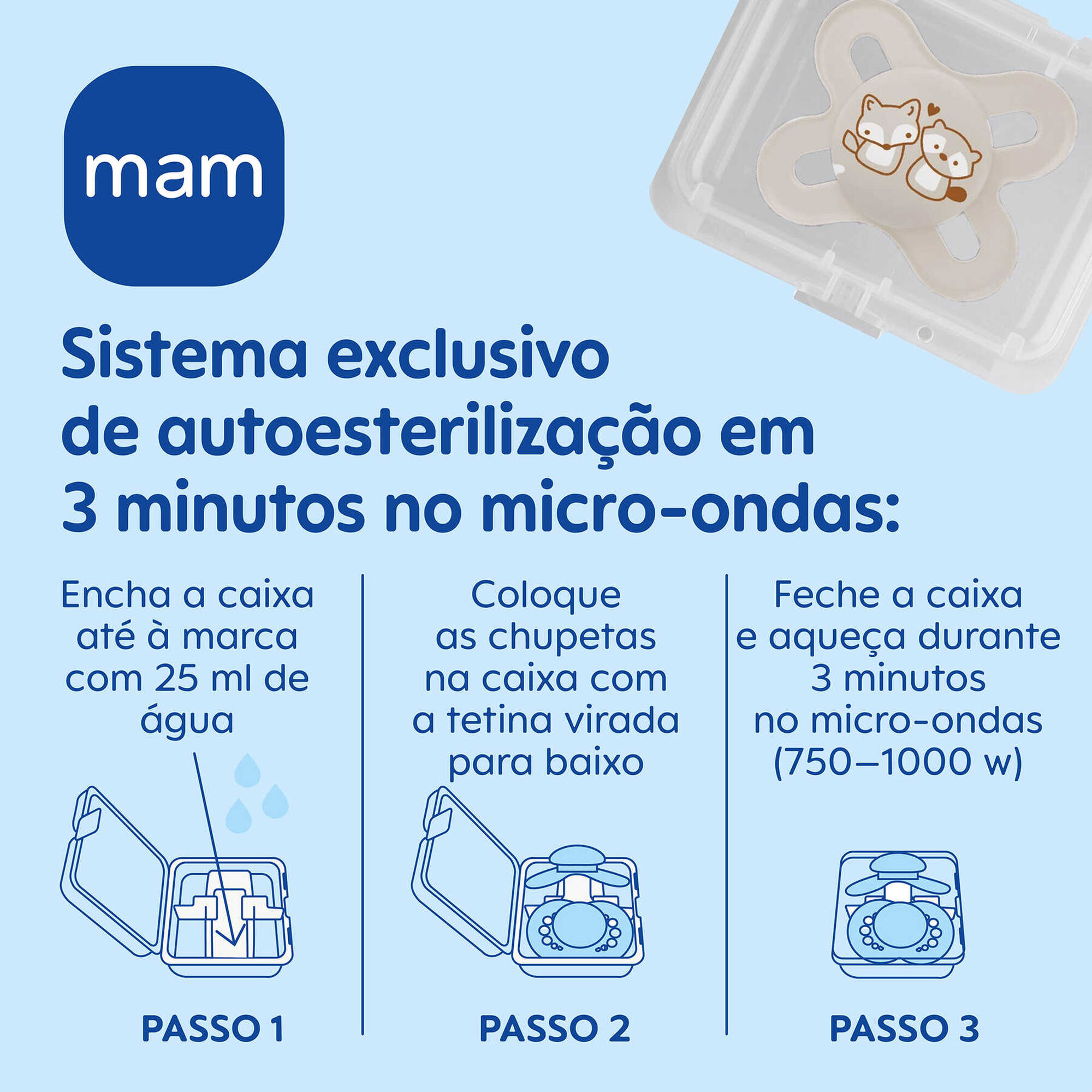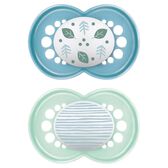 Conjunto de 2 Chupetas Ergonómicas, com forma única. Ortodôntica. Indicada para bebés a partir de 6 meses. Em azul e verde.