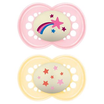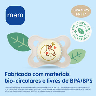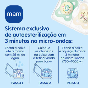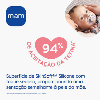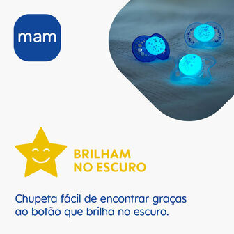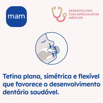 Tetina simétrica em forma de gota, brilha no escuro. A chupeta da MAM com amplos orifícios de ventilação e ondulações patenteadas permite a circulação do ar, para evitar irritações cutâneas é a solução ideal para prevenir uma má formação dentária.