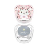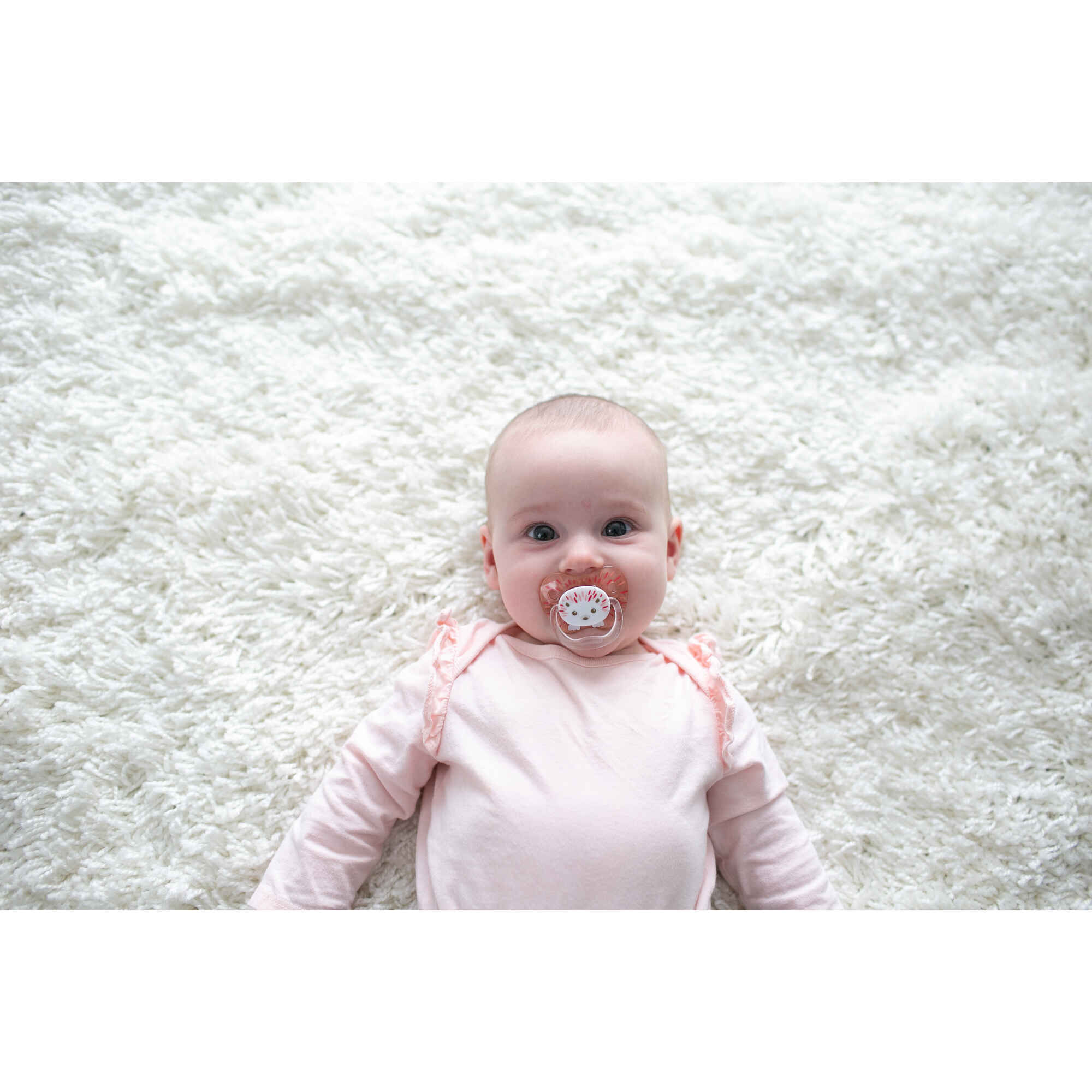 Divertidas chuchas ortodônticas Prevent Girl Silicone com design exclusivo, que ajuda a minimizar a pressão dentro da boca do bebé, prevenindo problemas de dentes. Indicada para bebés entre os 0 e os 6 meses.