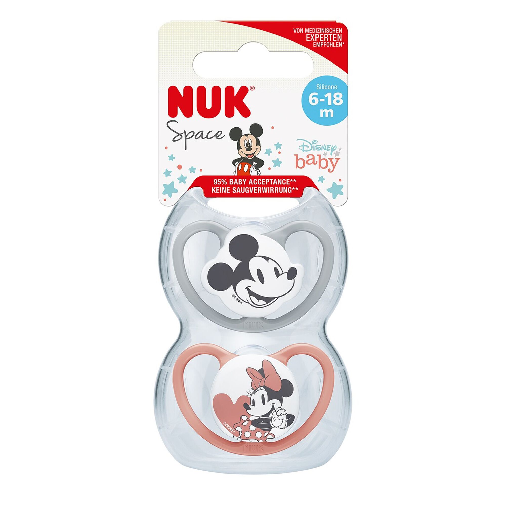 NUK Space Silicone especialmente concebida para bebés com pele sensível. Orifícios de ventilação extra-largos permitem o máximo de circulação de ar, deixando a pele respirar. Forma da tetina baseada no formato do mamilo da mãe enquanto amamenta, permitindo um encaixe perfeito na cavidade oral do bebé. Tamanho 6 - 18 meses. Com embalagem que permite a higienização da chupetas no micro-ondas bem como o transporte das mesmas.
