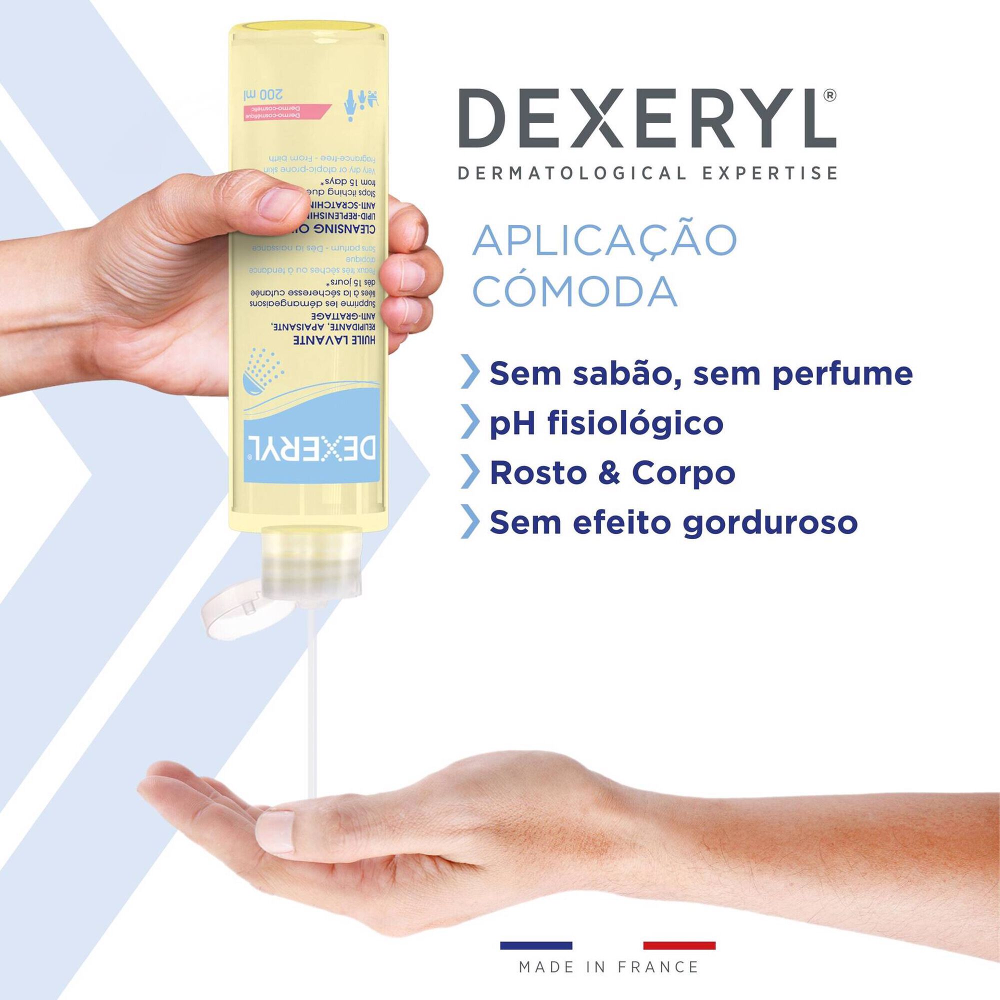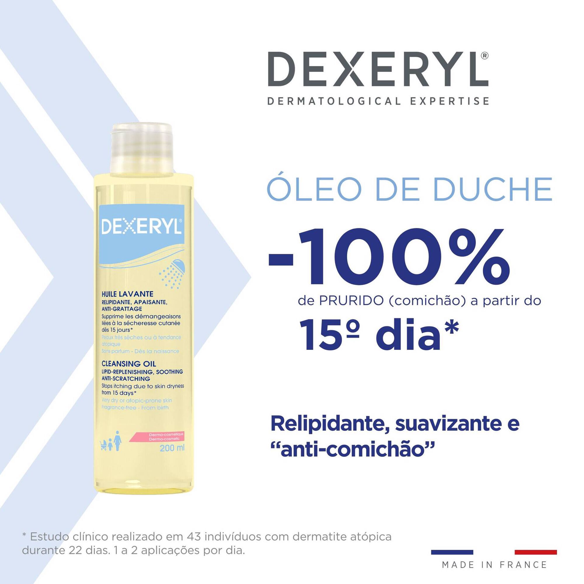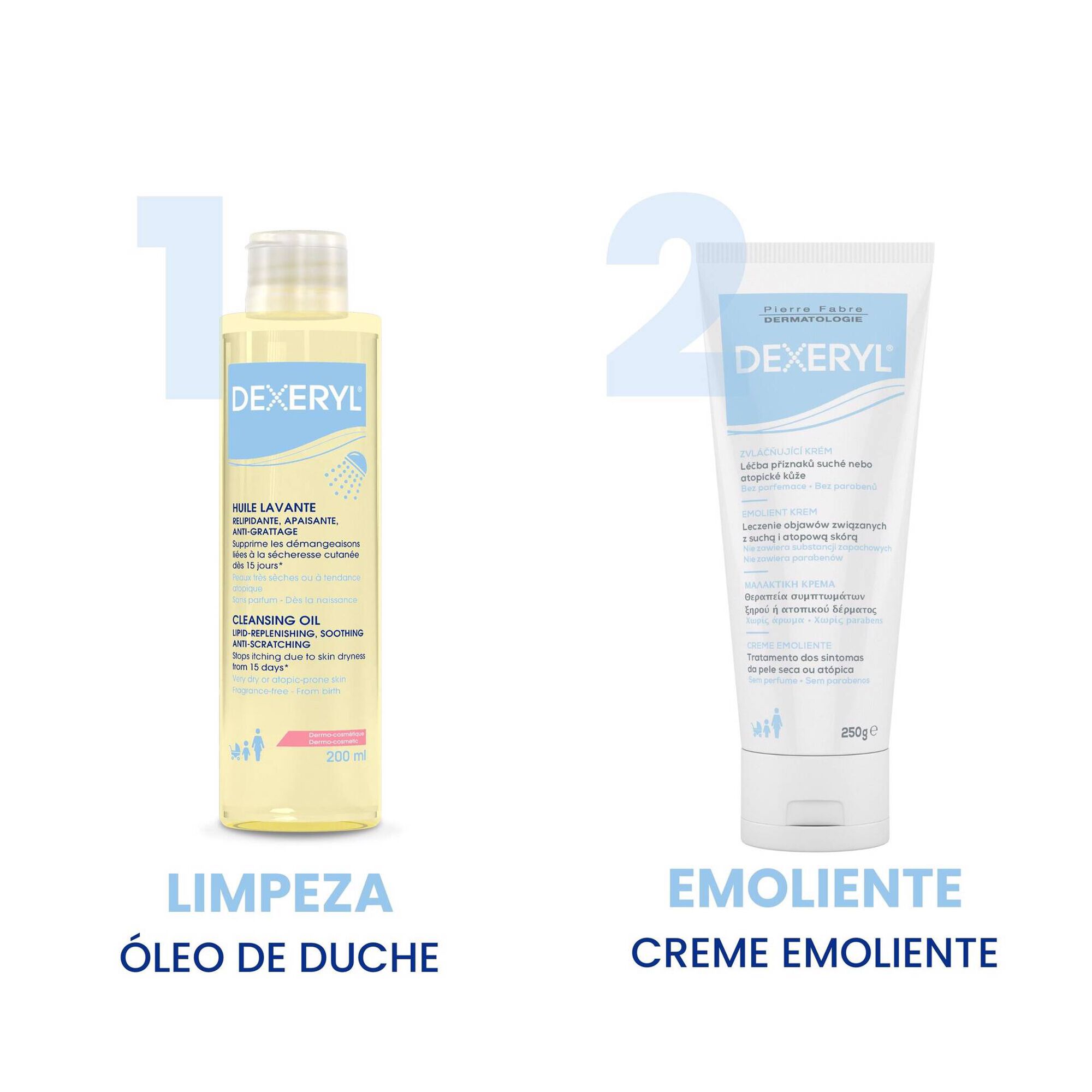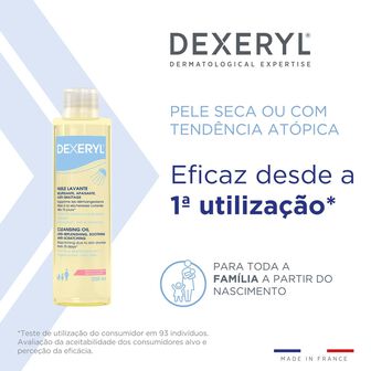 Dexeryl Óleo de Duche foi especialmente concebido para limpar, acalmar e nutrir suavemente a pele seca, muito seca ou com tendência atópica, preservando simultaneamente a barreira cutânea.