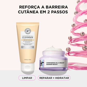 De seguida, aplica Confidence in a Cream Barrier Boost (60 ml), um creme leve com efeito calmante que proporciona até 100 horas de hidratação. Formulada com niacinamida, esqualano, extrato de centelha asiática e aveia coloidal, fortalece a barreira cutânea e reduz vermelhidão, secura e irritações.
