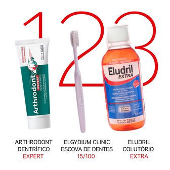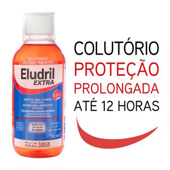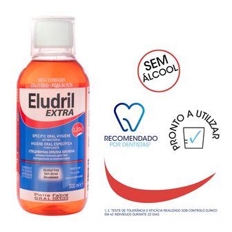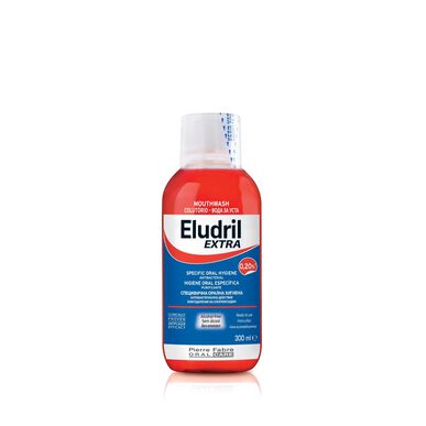 Colutório Eludril Extra ajuda a combater a formação da placa bacteriana e a prevenir o desenvolvimento ou agravamento dos problemas das gengivas, contribuindo para uma melhor saúde oral. Conta com uma concentração ótima de cloro-hexidina 0,20% e um efeito prolongado até 12 horas. Pode ser utilizado como complemento em tratamentos periodontais ou implantares.