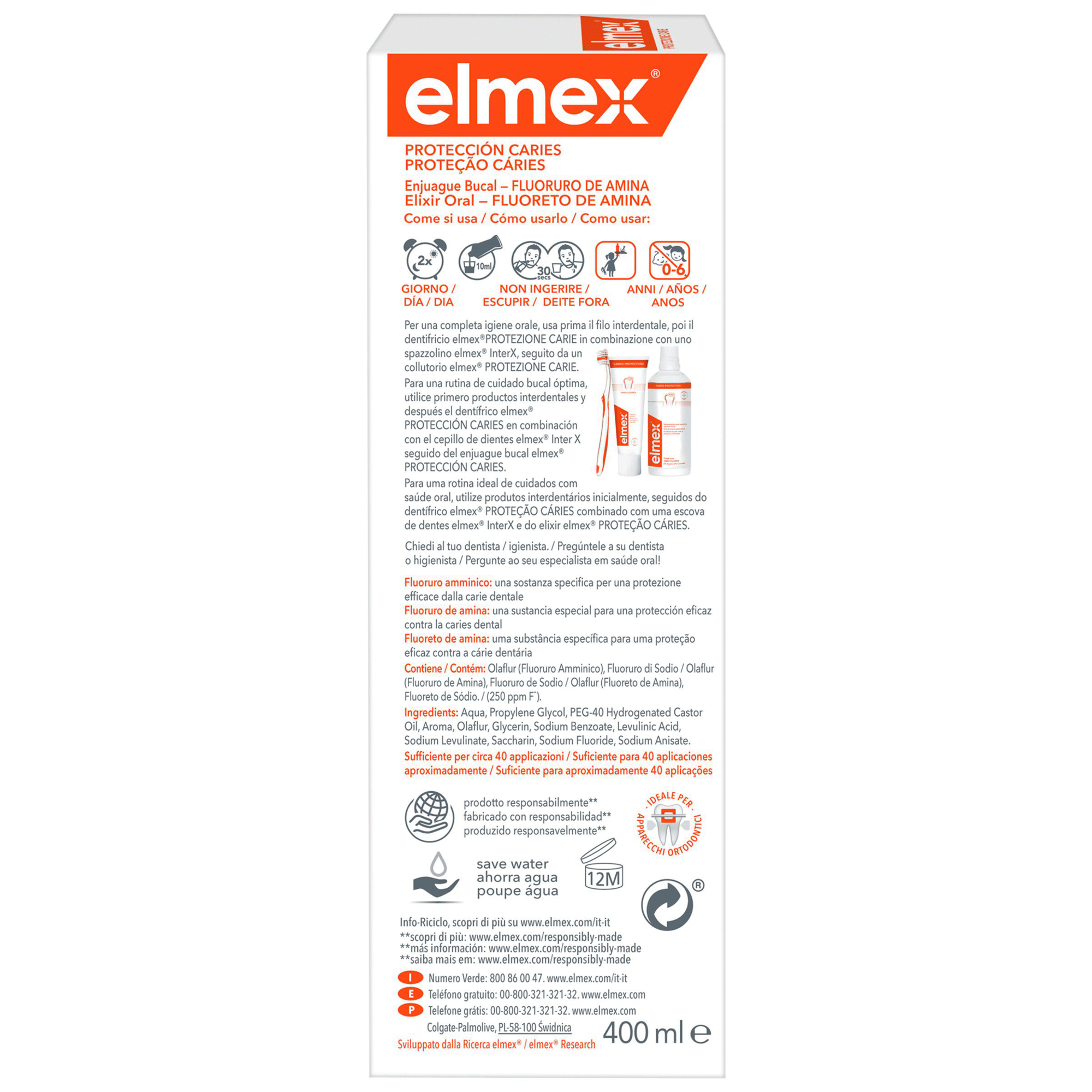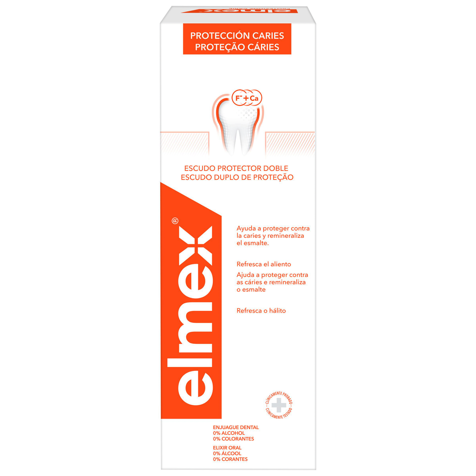 A fórmula altamente eficaz do elixir elmex® com fluoreto de amina cria uma camada protetora de fluoreto de cálcio que mineraliza os dentes e os protege eficazmente contra as cáries.