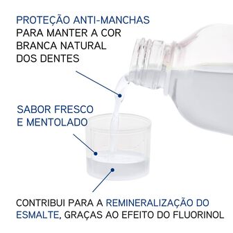 É um colutório, de uso diário, que pode ser utilizado após a escovagem para dentes mais fortes e mais brancos. Sem álcool, ajuda a limitar a aderência dos agentes colorantes à superfície do dente e ajuda a limitar o desenvolvimento da placa bacteriana. O sabor mentolado promove uma sensação de boca limpa e saudável.