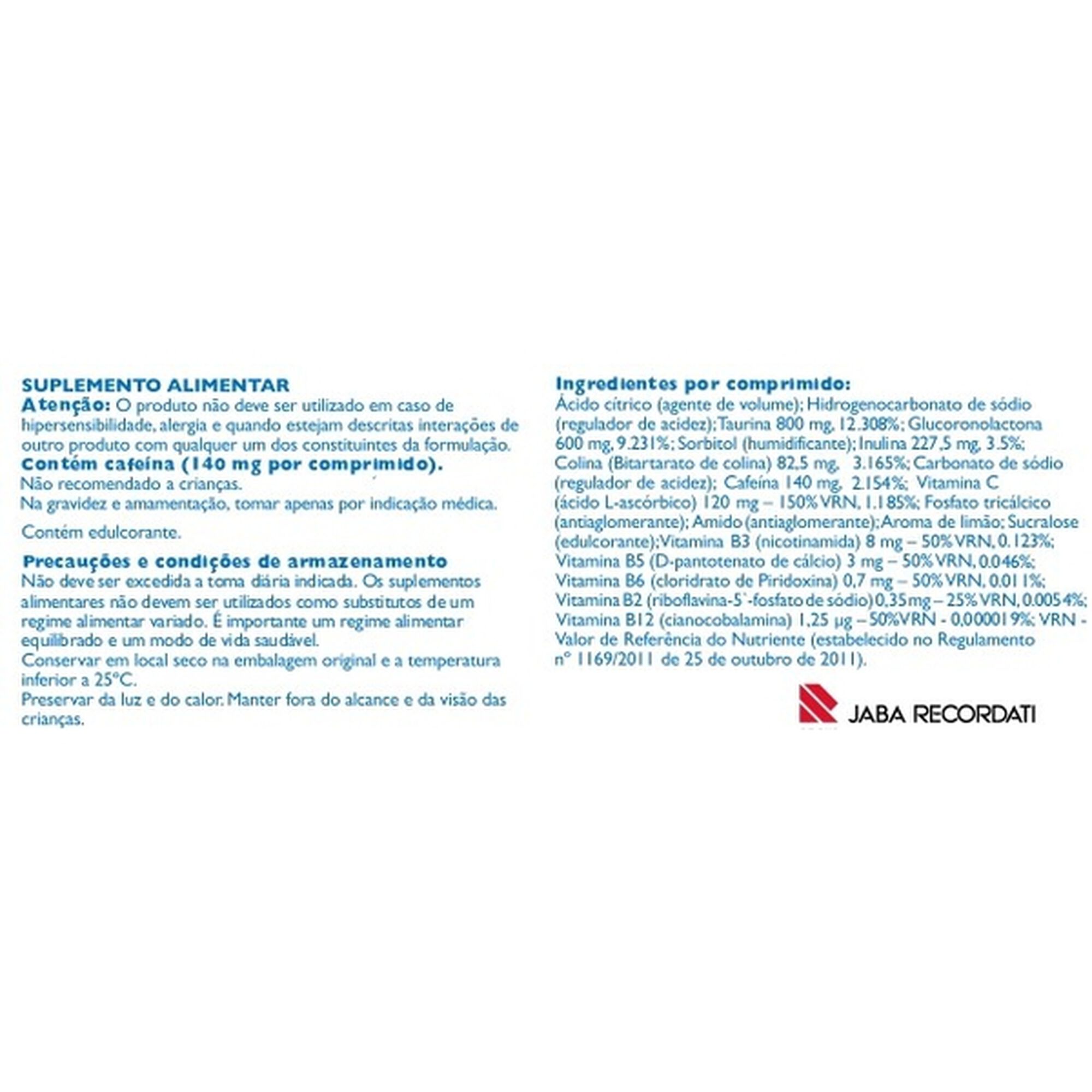 Multivitamínico e um boost energético que promove um funcionamento natural do seu metabolismo e produz energia. Tem uma fórmula rica em taurina e vitamina B para aumentar a energia imediata. Contém cafeína (140mg por comprimido) o que ajuda a reduzir o cansaço excessivo e a sensação de fadiga. Promove naturalmente o funcionamento do sistema nervoso e imunitário. Cuida também da função psicológica e reduz o cansaço físico e intelectual. Ainda com tudo isto, aumenta o nível de concentração e a perfomance muscular.