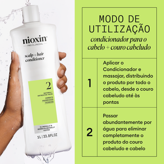 O condicionador do Sistema 2 da Nioxin melhora a saúde do couro cabeludo promovendo condições saudáveis para o crescimento do cabelo para mulheres e homens. Além disso, sua fórmula contém óleo de hortelã-pimenta para eliminar qualquer tipo de impureza e excesso de sebo.
