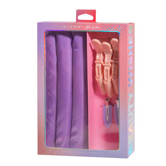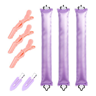 Pack composto por: 3 rolos de cetim para ondas suaves sem calor, 2 ganchos anti-frizz que prendem o cabelo sem deixar marcas e 3 ganchos de crocodilo ideais para seccionar o cabelo enquanto aplicas a maquilhagem, penteias ou fazes a tua rotina de cuidado capilar.