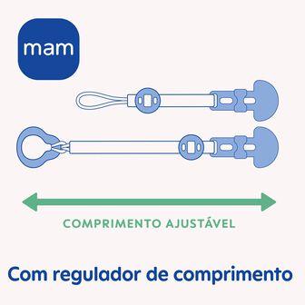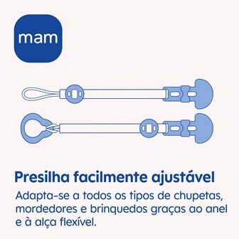 Com a sua correia flexível, é fácil e rápido prender chupetas de argola, anéis de dentição, brinquedos e mais. O anel é fácil de remover para que possa prender chupetas MAM bem como outras chupetas sem argola.