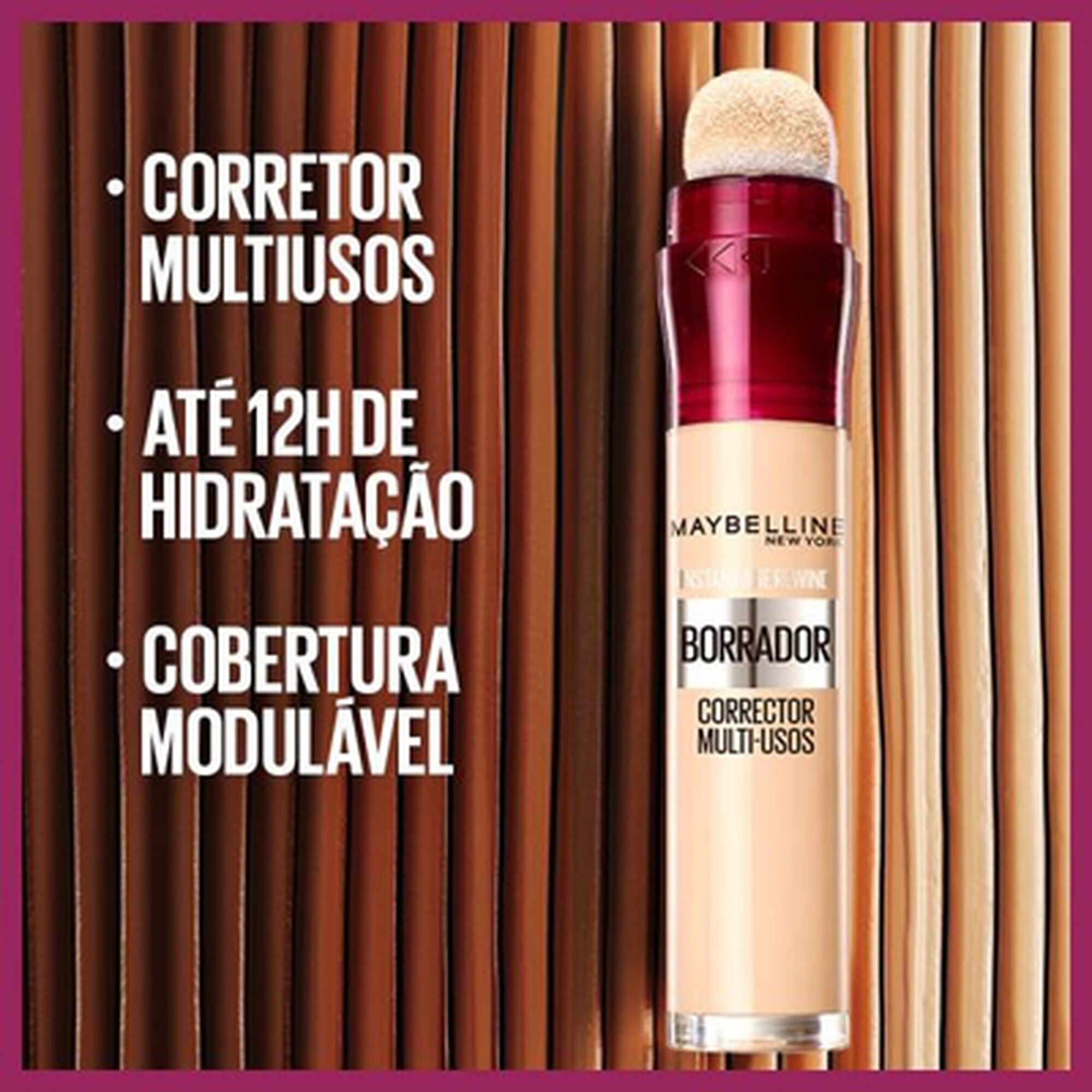 O Corretor Instant Eraser Multiusos, da Maybelline NY, apaga olheiras e bolsas, cobre imperfeições, ilumina o olhar e define o rosto.