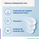 Hidrata intensamente até 24 horas, equilibrando o nível de hidratação da própria pele. A fórmula com complexo de cuidado hidratante NIVEA, Vitamina E, Extrato de Lótus, refresca e preenche a pele com uma hidratação de rápida absorção.