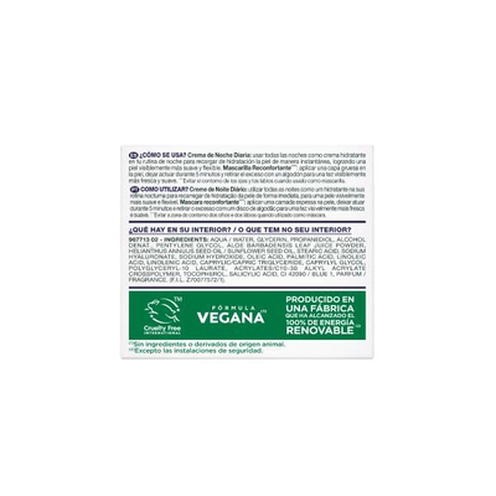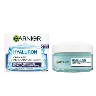 Creme de Noite Garnier Aloe Hialurónico com Ácido Hialurónico + Aloe Vera + Óleo de Argão. Hidrata intensamente – Nutre – Preenche. 98% de ingredientes de origem natural. Fórmula vegana com textura em gel refrescante que hidrata a pele durante 48h e proporciona um efeito preenchimento, deixando a pele visivelmente mais saudável e descansada.