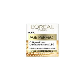 Descubra a eficácia antiflacidez e antimanchas da idade, com o creme de dia antiflacidez, L'Oréal Paris Age Perfect Colagénio Expert. Enriquecido com peptídeos de microcolagénio, um componente natural do colagénio. Com um tamanho de apenas 3 nanómetros - mais pequeno que um poro - quando combinado com outro peptídeo, ativa uma resposta natural que potencializa a firmeza da pele. Ideal para peles maduras.
