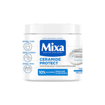 Descubra o novo Creme Fortalecedor Ceramide Protect para pele muito seca de Mixa Sensitive Skin Expert, para rosto, corpo e mãos, formulado com 10% de Glicerina, Escualano e Ceramidas.