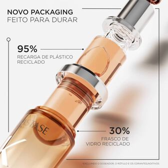 O frasco recarregável é fabricado com uma elevada percentagem de plástico reciclado*.