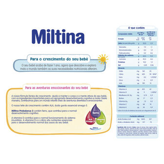 A fórmula Miltina Probalance® 3, para bebés a partir dos 12 meses contribui para o crescimento saudável do seu bebé, fornecendo todos os nutrientes necessários para o desenvolvimento cognitivo e motor, adequados à idade.