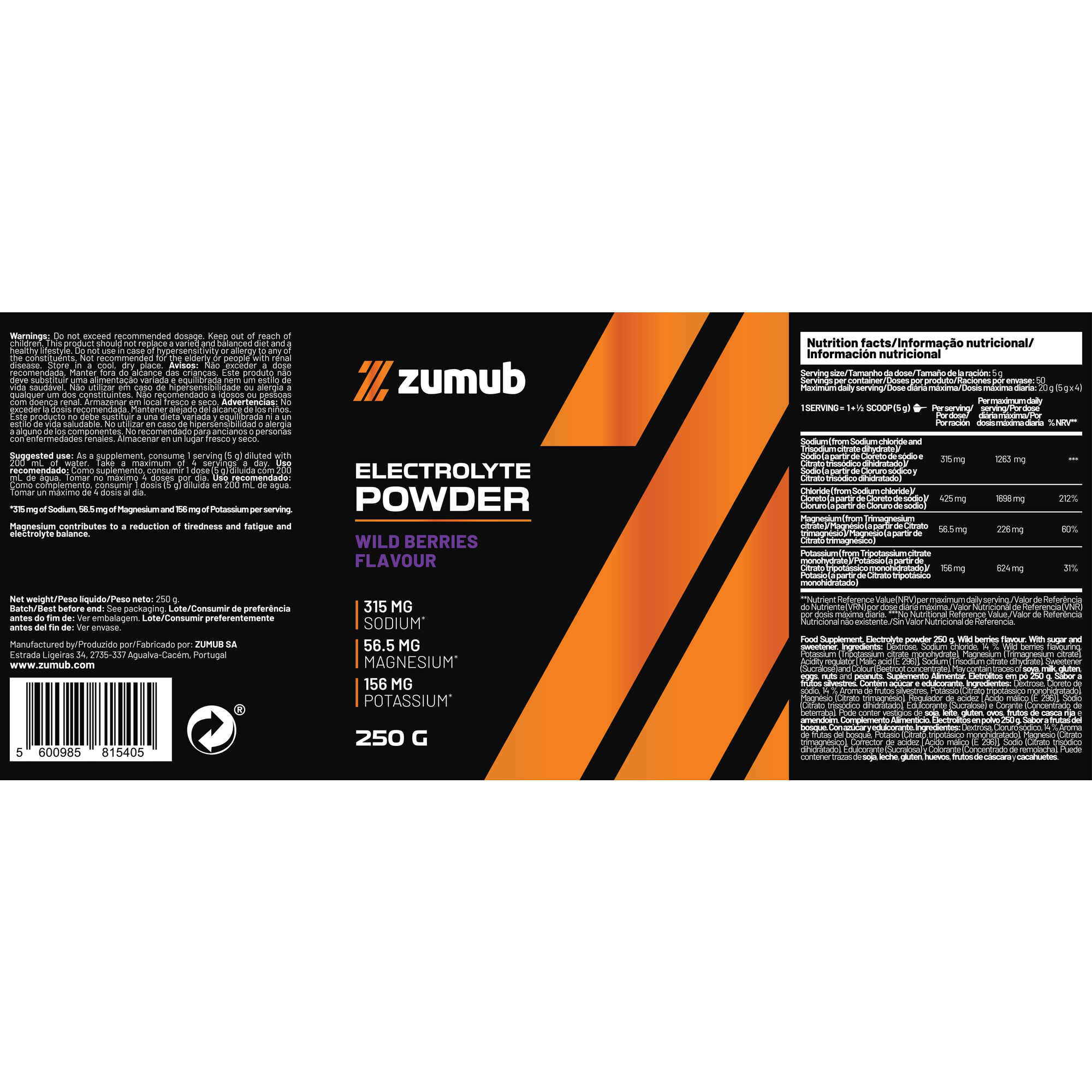 Dextrose, Cloreto de sódio, 14 % Aroma de frutos silvestres, Potássio (Citrato tripotássico monohidratado), Magnésio (Citrato trimagnésio), Regulador de acidez [Ácido málico (E 296)], Sódio (Citrato trissódico dihidratado), Edulcorante (Sucralose) e Corante (Concentrado de beterraba).