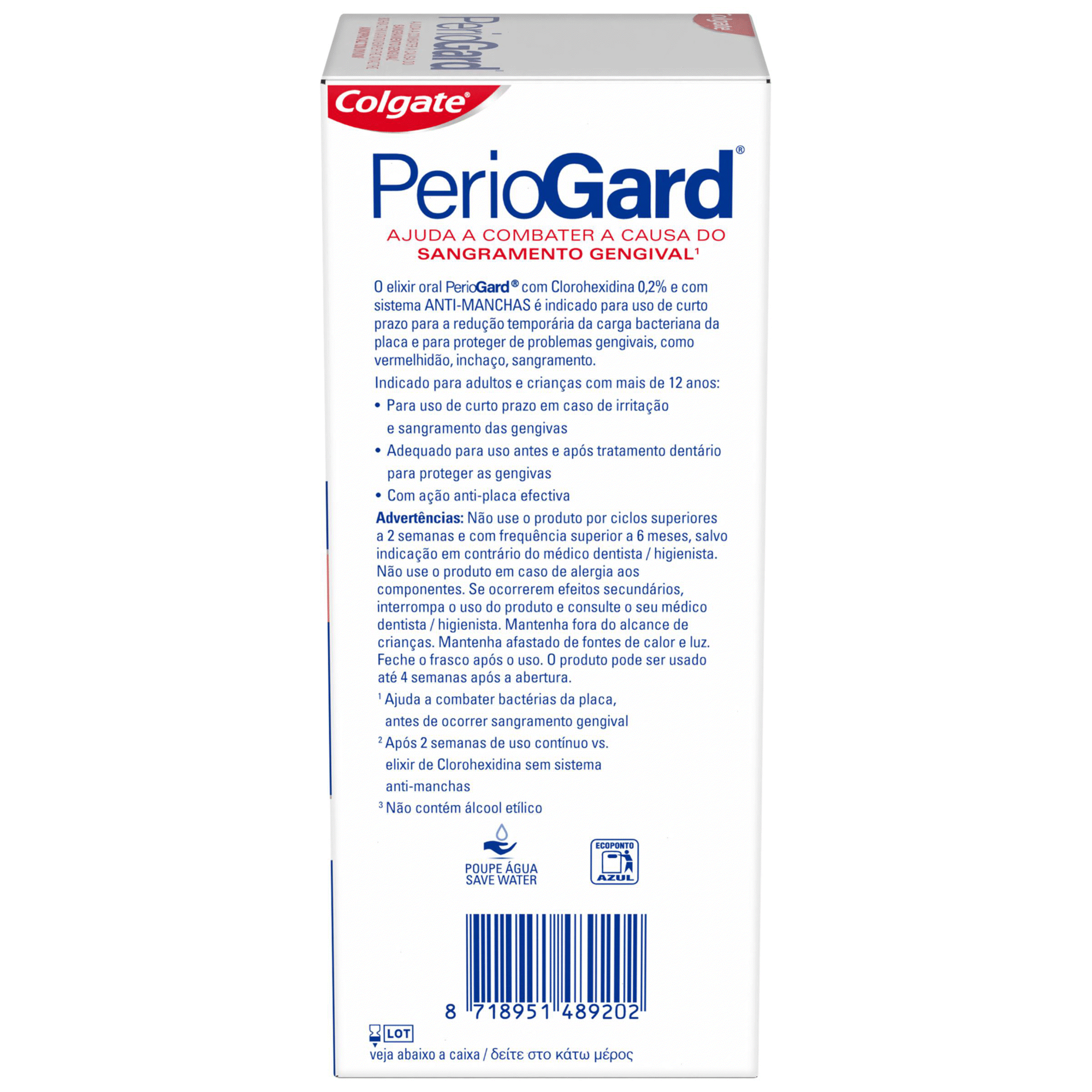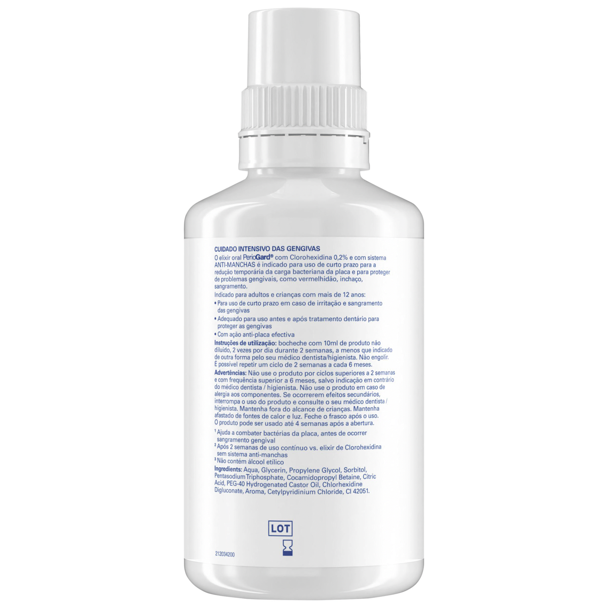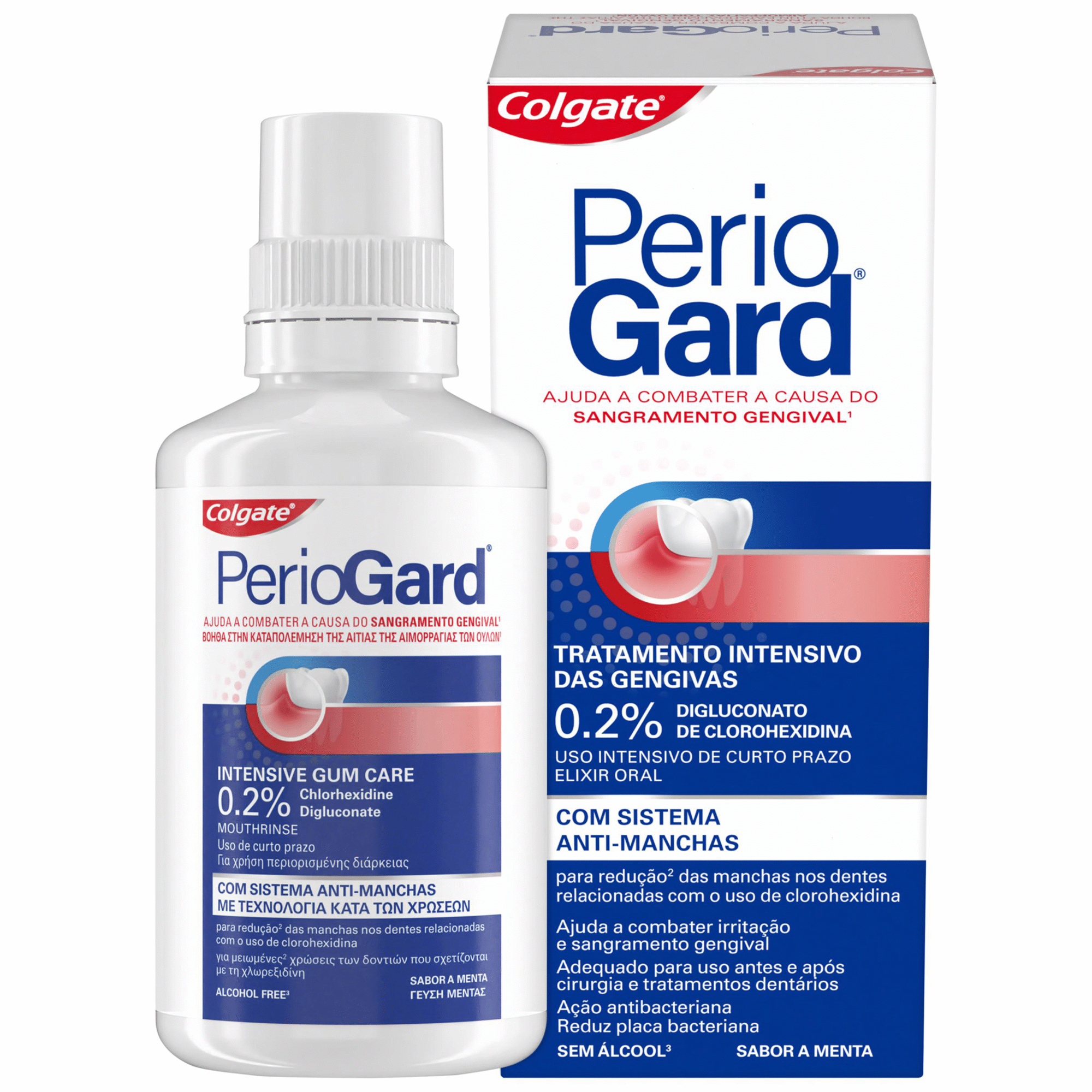 PerioGard Cuidado das Gengivas Clorohexidina 0,2% com sistema anti-manchas é um colutório que contém digluconato de clorohexidina, clinicamente testado para proteger contra a acumulação de placa e reduzir as bactérias que podem causar problemas gengivais.