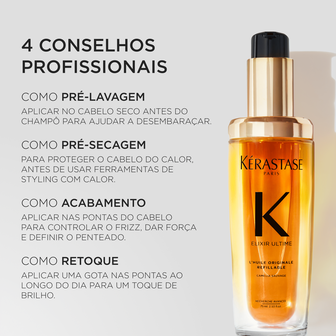 Descubra o segredo de um cabelo sublime com o nosso óleo Kérastase Elixir Ultime L'Huile Originale, o nosso primeiro óleo capilar recarregável concebido para durar ao longo do tempo. Este trabalho de inovação e sustentabilidade combina o melhor da natureza e da tecnologia para lhe proporcionar resultados excepcionais.
