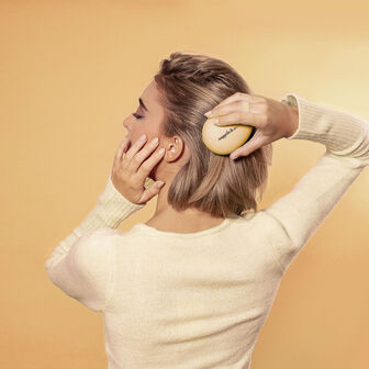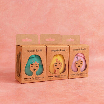 A escova de cabelo Tangle Tamer Brush em amarelo da Nuggela & Sulé pode ser utilizada para desembaraçar os nós do cabelo ou para aplicar e distribuir máscaras.