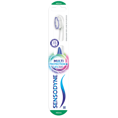 Com a sua pequena cabeça inclinada, com cerdas exteriores macias, e cerdas interiores cruzadas, a escova de dentes Sensodyne Ação Completa Média é adequada para pessoas com dentes sensíveis.