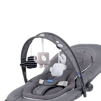 Uma confortável espreguiçadeira que inclui um arco com brinquedos suspensos em tecido e acolhe o bebé desde o nascimento até no máximo, 18 kg de peso. Arco de brinquedos com SlideSystem para permitir deslocar os brinquedos de modo a promover o desenvolvimento sensorial, cognitivo e psicomotor do bebé. O encosto pode ser reclinado em 4 posições diferentes para se adaptar às necessidades do bebé. A espreguiçadeira pode ser usada em dois modos: fixo ou de baloiço.