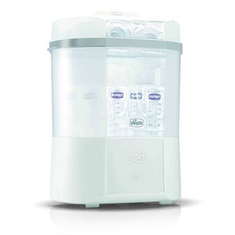 Esterilizador a vapor elétrico. Ajustável. Duas configurações. Prático e eficaz. A nova linha de esterilizadores Chicco adapta-se às necessidades da mãe e do bebé. Pode escolher entre diferentes modelos e configurações, para esterilizar de forma eficaz e eficiente todos os acessórios do bebé. Ocupa pouco espaço na cozinha, graças ao seu prático tamanho. Pode escolher entre 2 configurações diferentes: Full size (Para esterilizar até 6 biberões de 330ml) e Compact size (Para esterilizar até 2 biberões de 330ml, 1 bomba saca-leite e pequenos objetos do bebé, como chupetas), dependendo dos objetos a serem esterilizados. Elimina 99.9% dos germes prejudiciais à saúde. A vapor e sem aditivos químicos.