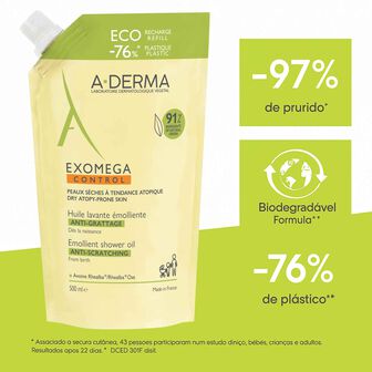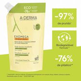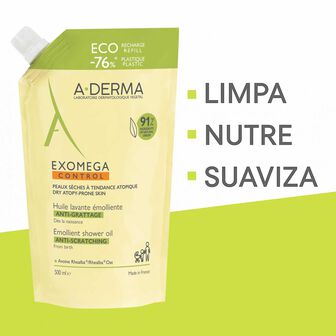 A recarga de óleo de duche Exomega Control para pele seca da A-Derma limpa e acalma a pele seca e frágil com tendência para eczema atópico.
