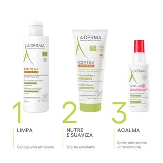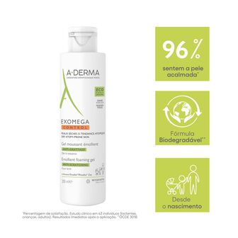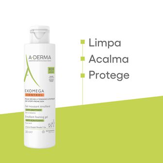 Exomega Control Gel espuma emoliente limpa com suavidade, acalma e protege a pele seca e de tendência atópica. Acalma a sensação de comichão associada à secura cutânea e protege a pele diariamente contra a secura. Sem sabão, sem perfume. Rosto, corpo. Bebé, criança, adulto. seca e de tendência atópica.